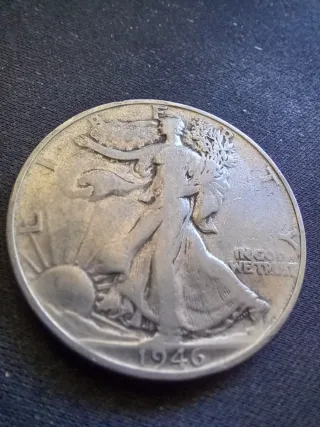 Moneda de medio dólar Walking Liberty de 1946. - Plata 900. - Diseño de la Libertad caminando.