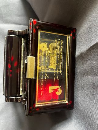 Encantadora caja musical con forma de piano, ideal como joyero decorativo. Contiene una cita inspiradora. - Diseño de piano clásico. - Acabado brillante. - Cita To compose a moving song with life and love. - Compartimento para joyas. Caja musical decorativa en forma de piano clásico. Funciona con mecanismo de cuerda. Interior forrado en terciopelo rojo y amarillo. Ideal como joyero pequeño o pieza de colección. En buen estado general, con leves señales de uso.