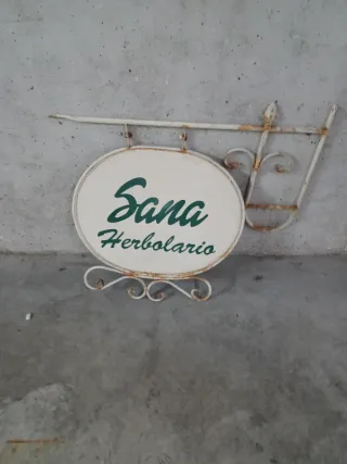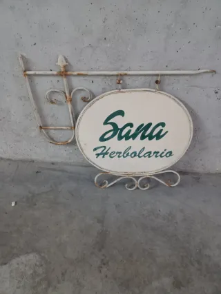Cartel decorativo doble cara - Diseño de bandera, para colgar. - Estructura metálica con acabado blanco y detalles oxidados. - Forma ovalada con adornos. - Letras en color verde.