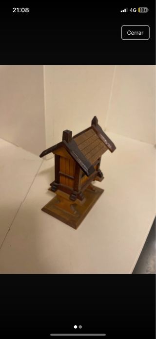 Original caja decorativa con un diseño inspirado en una pagoda o templo asiático. Fabricada con materiales naturales como bambú o madera. - Estructura de madera y tiras de bambú. - Tejado a dos aguas con detalles. - Base con diseño de puente o arco.