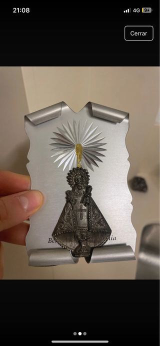 Detalle decorativo religioso con la imagen de la Virgen María. - Base metálica con diseño de pergamino. - Figura central de la Virgen en metal. - Aureola con rayos plateados y detalles dorados.
