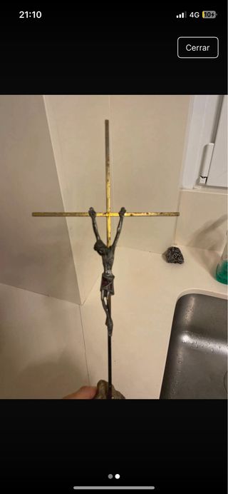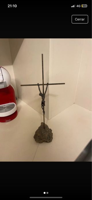 Figura religiosa de Cristo crucificado sobre una base de piedra. - Material: Metal y piedra. - Diseño artesanal.