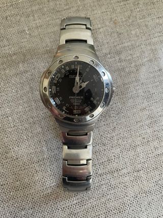 Reloj Seiko Premier con función de calendario perpetuo. - Caja y brazalete de acero inoxidable. - Esfera negra. - Resistencia al agua de 100 metros.