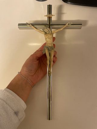Plato decorativo con diseño religioso y asa. - Elaborado en metal plateado. - Presenta grabados florales y una figura central. - Asa retorcida para facilitar su transporte.