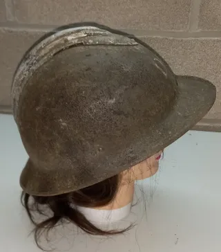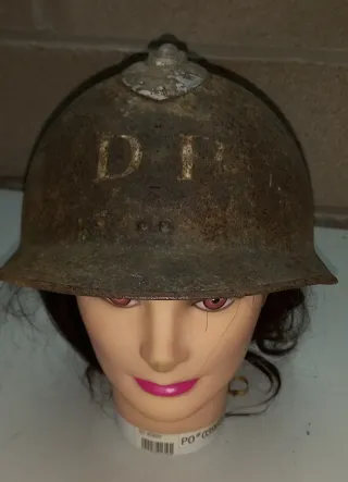 Casco de acero modelo Adrián, utilizado por el ejército francés durante la Segunda Guerra Mundial. - Diseño característico del casco Adrián. - Marcado con las iniciales DP en la parte frontal.