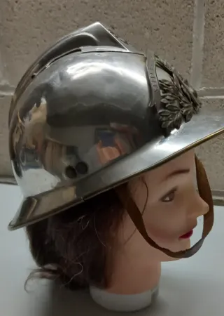 Casco de bombero de estilo francés, con un diseño clásico y detalles ornamentales. - Fabricado en metal plateado. - Insignia frontal con escudo y corona. - Adornos laterales de laurel. - Correa de cuero para barbilla.
