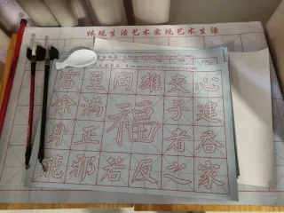 Set de caligrafía china para practicar con agua. Incluye un tapete de práctica con cuadrícula y caracteres preimpresos, dos pinceles de caligrafía y una pequeña pala. - Tapete de práctica con diseño de caligrafía. - Dos pinceles de caligrafía. - Pala pequeña. Al escribir se queda la marca de agua. Pero según va secando, se puede volver a reutilizar.