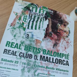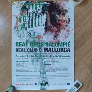 Cartel original del partido Real Betis Balompié vs RCD Mallorca disputado el 22 de diciembre de 2012, correspondiente a la temporada 2012-2013 de Primera División. Pieza oficial de la época, excelente para coleccionistas de memorabilia verdiblanca o aficionados a la historia reciente del fútbol español. Perfecto para conservar, enmarcar o completar colecciones de partidos destacados del Betis. Artículo auténtico y muy poco común.