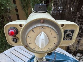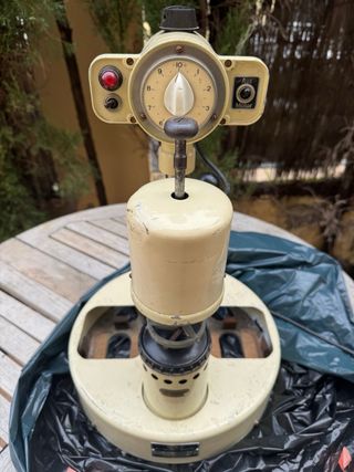 Máquina lavadora de relojes Elma Súper Élite. Modelo de 220v y 90w. Funciona todo tanto motor como secador calentador y reloj alarma. Trae la tapa original del calentador, que en la mayoría se ha perdido Necesita limpieza y restauración estética, presenta arañazos y alguna abolladura.