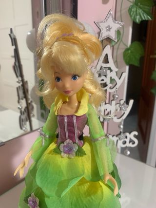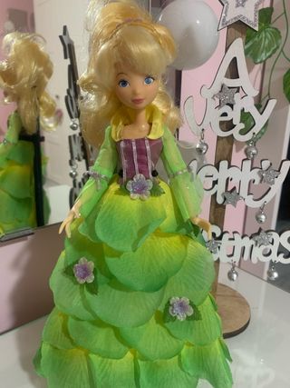 Muñeca de hada con un vestido verde y detalles florales. - Vestido con pétalos verdes y amarillos. - Adornos de flores moradas con brillo. - Cabello rubio recogido en coleta.