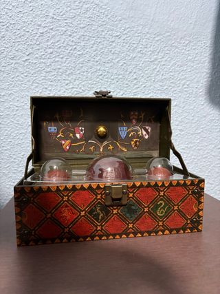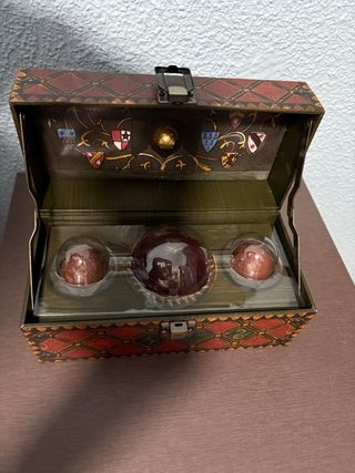 Caja decorada con motivos de Quidditch, inspirada en el mundo mágico. - Diseño con escudos y símbolos. - Incluye tres bolas de Quidditch bajo cúpulas protectoras.