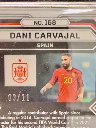 - Trading Card del año 2022-23. - Posibilidad de entrega en mano durante la SDCC Málaga. - Colección: PANINI OBSIDIAN. - Versión: ELECTRIC ETCH WHITE PULSAR. - Cromo: DANI CARVAJAL #168. - Cromo numerado de tirada limitada: 03/11 - POP 1. Según los registros de PSA solo existen este cromo en Grado 10, es el único! - Perfecto estado conservación. Presentación impecable en funda protectora PSA. --------- 👉 PSA 10 GEM MT 10. ✅ PSA Certification Verification #116750827. -------- 🤝 Pago por Bizum, Wallapop, Transferencia o PayPal. 👀 Gracias por tu visita. Revisa mi perfil para otros cromos gradeados.