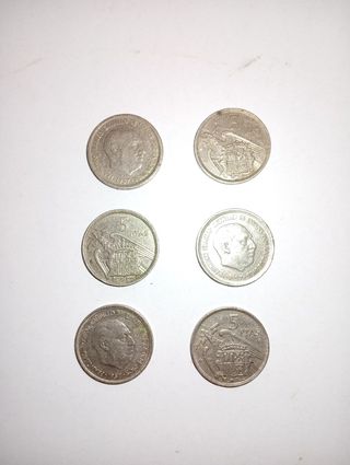 Se venden seis monedas antiguas de Francisco Franco, acuñadas en 1957. Son monedas de colección en buen estado de conservación. - Monedas de 5 peseta. - Se aprecian detalles del tiempo en algunas monedas. La cámara del móvil no se aprecia bien en el estado que están están mejor que la fotos precio a negociar tengo muchísimas monedas de Francisco Franco