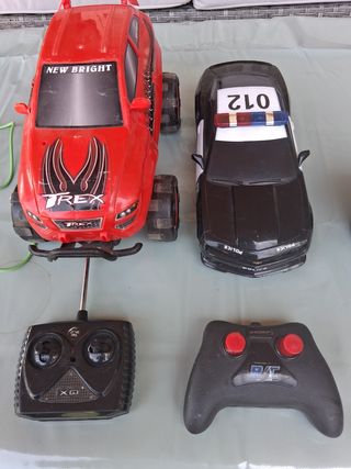 Se venden dos coches teledirigidos, uno rojo tipo todoterreno y otro negro de policía. Ambos coches se ven en buen estado y vienen con sus mandos a distancia. - Incluye dos coches teledirigidos. - Un coche es rojo y otro negro. - Se incluyen dos mandos.