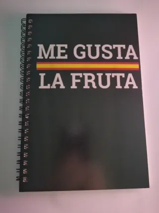 Cuaderno de espiral con un diseño llamativo. - Tapa dura con el lema Me gusta la fruta. - Diseño con los colores de la bandera española. - Encuadernación con espiral metálica. - NOTA: Este anuncio no está puesto para hacer ninguna apología.