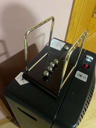 Un clásico péndulo de Newton con cinco esferas metálicas. - Base de madera oscura. - Marco metálico cromado.