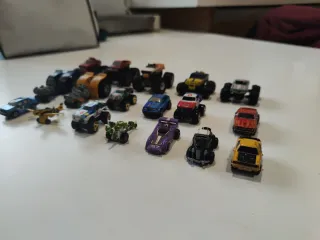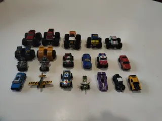 Colección variada de 18 coches y vehículos de juguete de la marca Micromachines. Incluye diferentes modelos y diseños. - Camiones monstruo - Coches de carreras - Avión - Vehículos todoterreno