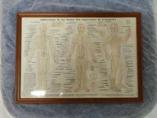Cuadro decorativo con ilustraciones detalladas de los puntos y meridianos de acupuntura. - Marco de madera. - Representación anatómica del cuerpo humano. - Información sobre puntos importantes de acupuntura. Medidas: 52x37,5