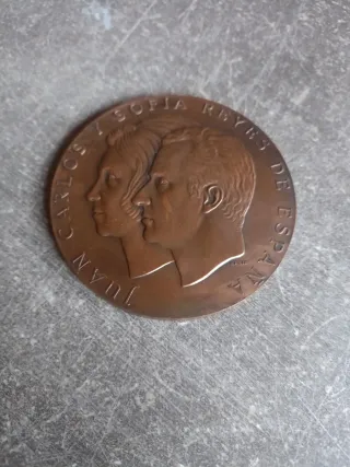 Medalla conmemorativa de la proclamación de los Reyes Juan Carlos y Sofía en 1975. Un recuerdo histórico. - Diseño con los perfiles de Juan Carlos I y Sofía de Grecia. - Inscripción Juan CARLOS Y SOFIA REYES DE ESPAÑA. 155 gramos de peso 80 mm de diámetro