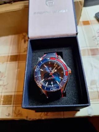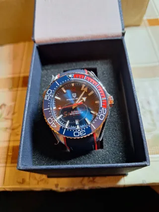 Reloj de pulsera Pagani Design con movimiento automático y caja de 39 mm. - Bisel giratorio. - Correa de tela azul con detalles rojos. - Esfera azul degradado.