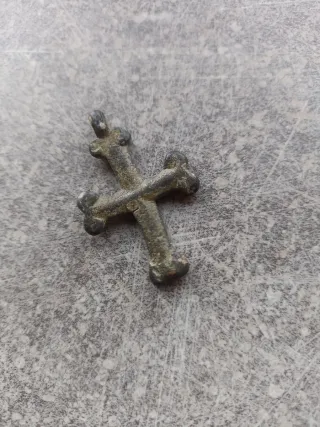 Este es un crucifijo de estilo medieval, con un diseño intrincado y un acabado que sugiere su antigüedad. - Material: Bronce - Estilo: Medieval - Diseño: Cruz con detalles ornamentales