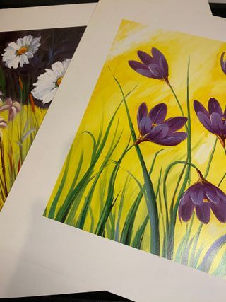 Dos láminas decorativas de alta calidad de la prestigiosa casa Dislama, S.L. (Barcelona). Presentan un acabado laminado que protege el color y facilita la limpieza. Estilo pictórico vibrante, ideal para decorar salones o dormitorios. Artistas: J. Sillero (Azafranes/Crocus) y M.A. Ojeda (Margaritas/Flores silvestres). Origen: Ediciones Dislama, S.L.. Estado: Muy bueno, listas para enmarcar.