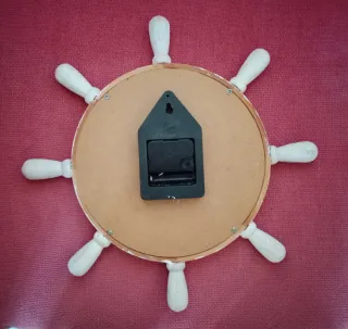 Reloj de pared decorativo con diseño de rueda de timón de barco. Añade un toque náutico a tu hogar. - Diseño inspirado en rueda de timón. - Marco blanco con detalles. - Esfera redonda con números.