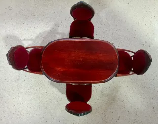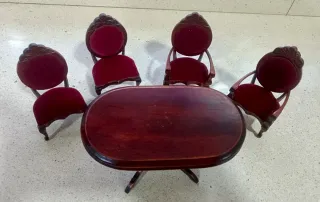 Conjunto de mesa y cuatro sillas para casa de muñecas. Ideal para recrear escenas de comedor. - Mesa de madera oscura con forma ovalada. - Cuatro sillas con tapicería de terciopelo rojo. - Diseño clásico y detallado.
