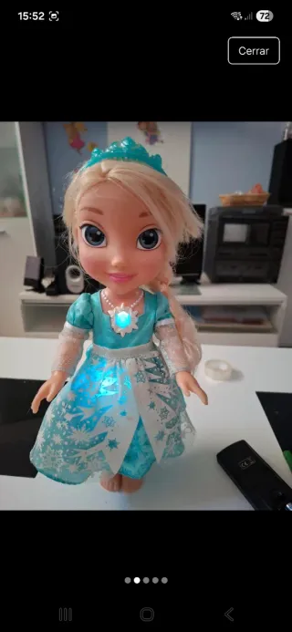 Set de muñeca y libro de la película Frozen. - Muñeca de Elsa con vestido azul y detalles brillantes. - Libro ilustrado de Frozen con Elsa en la portada -El libro está nuevo y la muñeca canta y sé la iluminación el vestido funciona perfectamente sólo la falta los zapatos