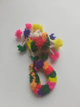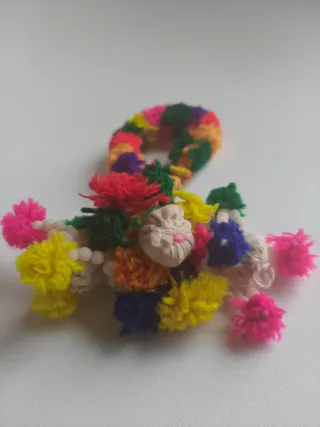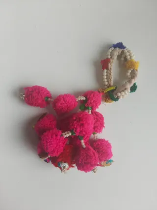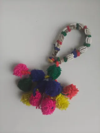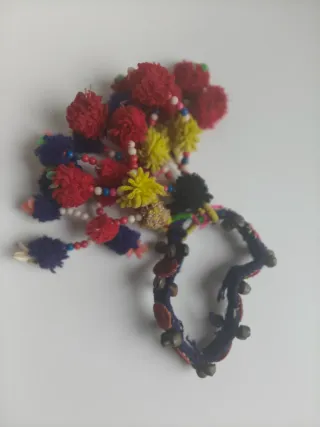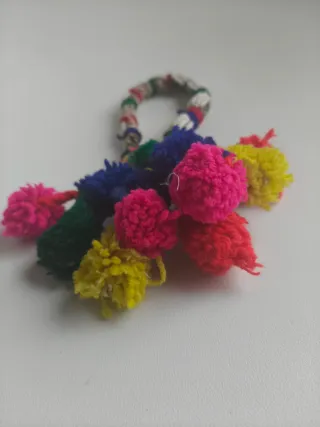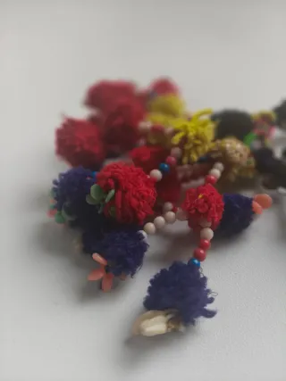 Adorno artesanal con pompones de colores, inspirado en la India. Ideal para añadir un toque vibrante a tus creaciones. - Pompones de lana en rojo, azul, amarillo y negro. - Cuentas de colores variados. - Detalles con cascabeles y borlas.