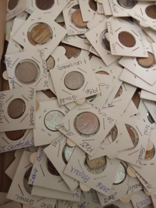 Colección de más de 250 monedas de Brasil, con diferentes años y valores.en unas condicionesmuy aceptables ebc++.las monedas estan encartonadas y por fechas las hay antiguas. - Incluye monedas de 25 centavos, 1 cruzeiro, 20 cruzeiros, 50 centavos, entre otras. - Fechas visibles en algunas monedas: 1985, 1986, 1994, 2003, 2004, 2005, 2006, 2009, 2010. - Algunas monedas están en su funda protectora original.