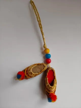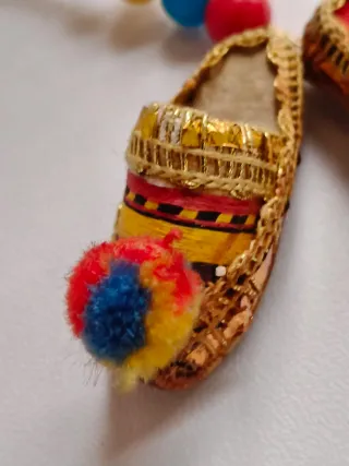 Llavero decorativo con forma de pantuflas, inspirado en la artesanía turca. - Diseño vintage. - Adornado con cuentas de colores y pompones. - Cadena dorada para colgar.