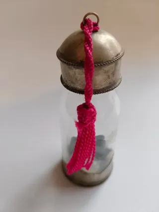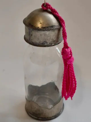 Original bote decorativo de estilo vintage, con detalles inspirados en Marrakech. - Cuerpo de cristal transparente. - Tapa y base de metal con acabado envejecido. - Adorno de borla fucsia.