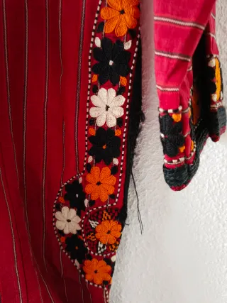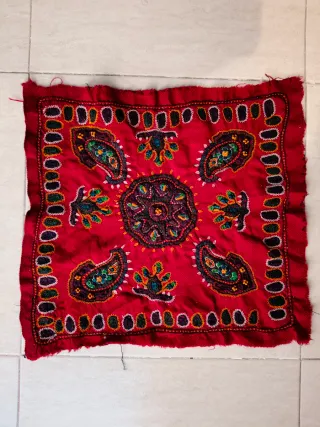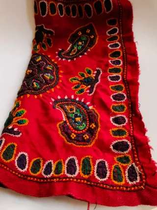Precioso mantelito o tela antigua de Irán, con un diseño intrincado y colores vibrantes. - Bordado a mano con motivos paisley. - Borde decorativo con detalles. - Tonos rojos predominantes con toques de azul, verde y morado.