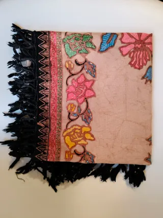 Pañuelo de seda con estampado batik tradicional de Indonesia. Presenta un diseño floral vibrante y colorido. Tiene una pequeña zona cosida debido a que se rompió. - Estampado batik. - Diseño floral. - Colores vivos.