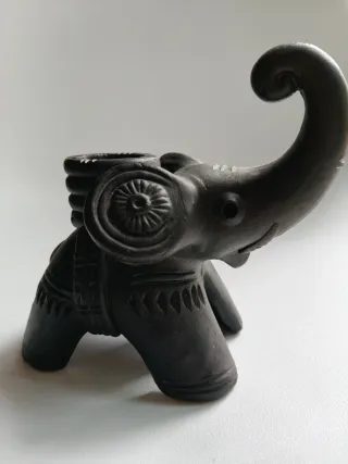 Figura decorativa de elefante en cerámica negra, con detalles inspirados en la artesanía de la India. - Material: Cerámica. - Color: Negro. - Origen: India. - Diseño detallado.