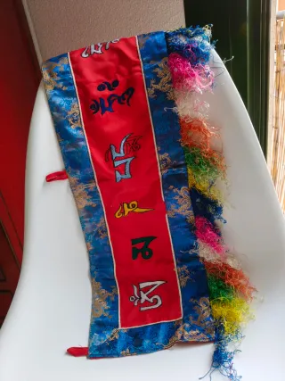 Precioso tangka de Nepal con mantras bordados. Om mani padme om. - Diseño tradicional con bordes azules y dorados. - Franjas de hilos de colores en un lateral. - Símbolos budistas bordados en rojo.