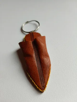 Llavero artesanal con diseño de babucha. - Material: Cuero. - Color: Marrón. - Detalle de costuras. - Borde dorado.