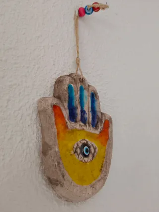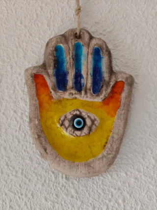 Colgante decorativo con forma de Mano de Fátima o Hamsa, elaborado en cerámica. Tiene un pequeño desconchon. - Diseño artesanal. - Detalles en azul, amarillo y naranja. - Incluye un ojo turco central.