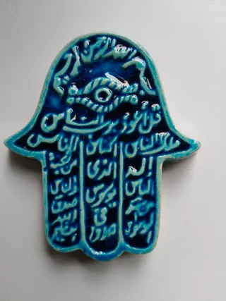 Este amuleto de la Mano de Fátima está hecho de cerámica azul y tiene inscripciones en árabe. Pequeña fisura por detrás y necesita enganche para colgar - Diseño de la Mano de Fátima. - Color azul vibrante. - Material: Cerámica. - Origen: Egipto.