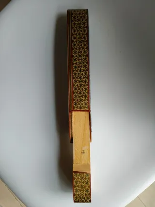 Elegante plumier de estilo persa, con un intrincado diseño. Tiene pequeños desperfectos de ahí su precio dado que tiene mucho trabajo. - Decoración geométrica detallada. - Tonos dorados y rojizos predominantes. - Forma alargada y estilizada.