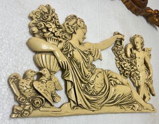Preciosa pieza de decoración elaborada en resina, con un diseño clásico. - Representa a una mujer reclinada junto a un cupido. - Incluye detalles florales y aves. - Ideal para añadir un toque artístico a cualquier espacio. Medidas: 54cm(largo)x30(ancho)x1cm(grosor)