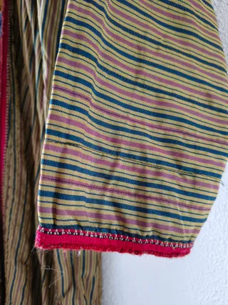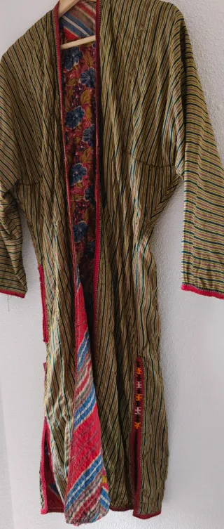 Prenda tradicional de seda con estampado Ikat, originaria de Uzbekistán. - Diseño de rayas verticales en tonos tierra y azul. - Forro interior con estampado floral en tonos rojos y azules. - Bordes decorados con detalles de hilo. - Aberturas laterales con adornos bordados.