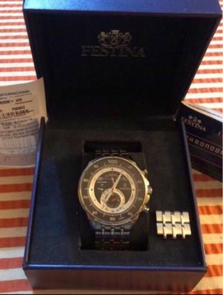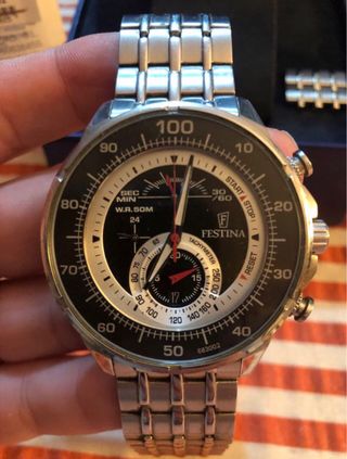Reloj Festina con cronógrafo y correa de acero inoxidable. - Caja de 45mm. - Esfera negra con detalles en blanco y rojo. - Bisel con taquímetro. - Estado: como nuevo. - Con caja y documentacion. - Armis original. - Incluye eslabones extra. - Cristal mineral. Entrega en mano o Envío