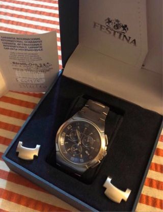 Reloj Festina con cronógrafo y esfera azul marino. Muy cuidado y elegante. - Caja y brazalete de acero inoxidable. - Cristal mineral - Armis de acero original. - Incluye caja y documentación. - Estado: como nuevo. Entrega en mano en o envío.