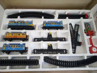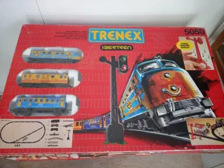 Antiguo Tren eléctrico Ibertren Trenex modelo 5050. Incluye varios vagones y vías. Una curva con punta rota. Caja estropeada. Tren funciona. Probada. Entrega en mano. No envío. Pieza sonido no se si va. Todo jugado. JUGUETE ANTIGUO IA: - Locomotora y vagones de colores azul y amarillo. - Señal de tráfico con luces. - Incluye vías para montar un circuito.