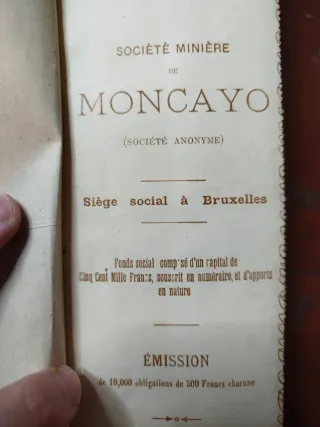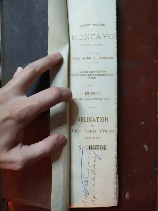 Libreto de acciones de la compañía belga Société Minière de Moncayo, propietaria de concesiones mineras en Soria donde explotaba el mineral de hierro, como por ejemplo la mina Petra, en Ólvega (Soria). Acciones firmadas por el abogado Henri de la Fontaine. Acciones adquiridas desde el 3771 al 3999. Procedente del archivo personal de Raoul Otlet, hijo de Edouard Otlet, magnate belga del ferrocarril al frente de la Sociedad Minera del Moncayo y del Ferrocarril de Soria entre otros. Etiquetas: Renfe, tren, minería, ferrocarril, ingenieros, locomotora, soria, acciones antiguas.