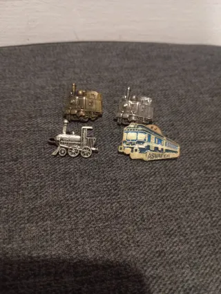 Conjunto de cuatro pines con diseños de locomotoras antiguas. - Diseño de locomotora de vapor dorada. - Diseño de locomotora de vapor plateada. - Diseño de locomotora de vapor plateada con detalles. - Diseño de tren moderno con texto LASVAFER.
