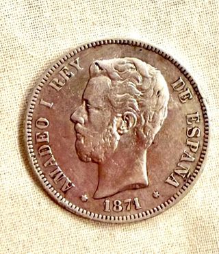 Moneda de plata conmemorativa de Amadeo I, Rey de España, acuñada en el año 1871. - Diseño detallado del perfil del rey. - Inscripción AMADEO I REY DE ESPAÑA en el canto. - Año de acuñación: 1871.