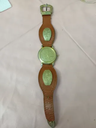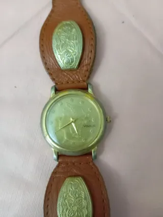Reloj de pulsera Vogue con un diseño vintage y detalles inspirados en monedas. - Correa de cuero marrón. - Hebilla y adornos metálicos con grabado. - Esfera redonda dorada.
